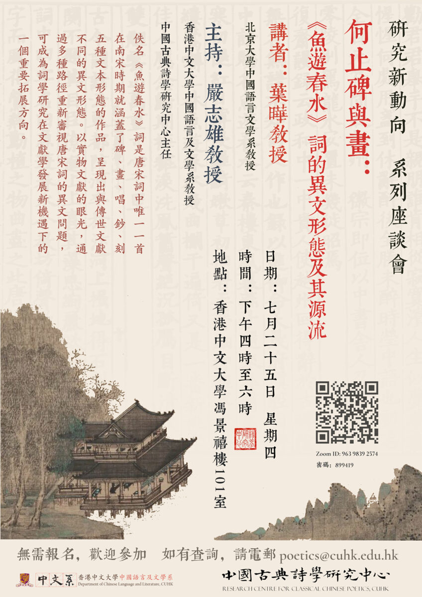 本系中國古典詩學研究中心將於7月25日舉行「研究新動向」系列座談會(二十六):何止碑與畫:《魚遊春水》詞的異文形態及其源流。誠邀出席參加,詳情如下: