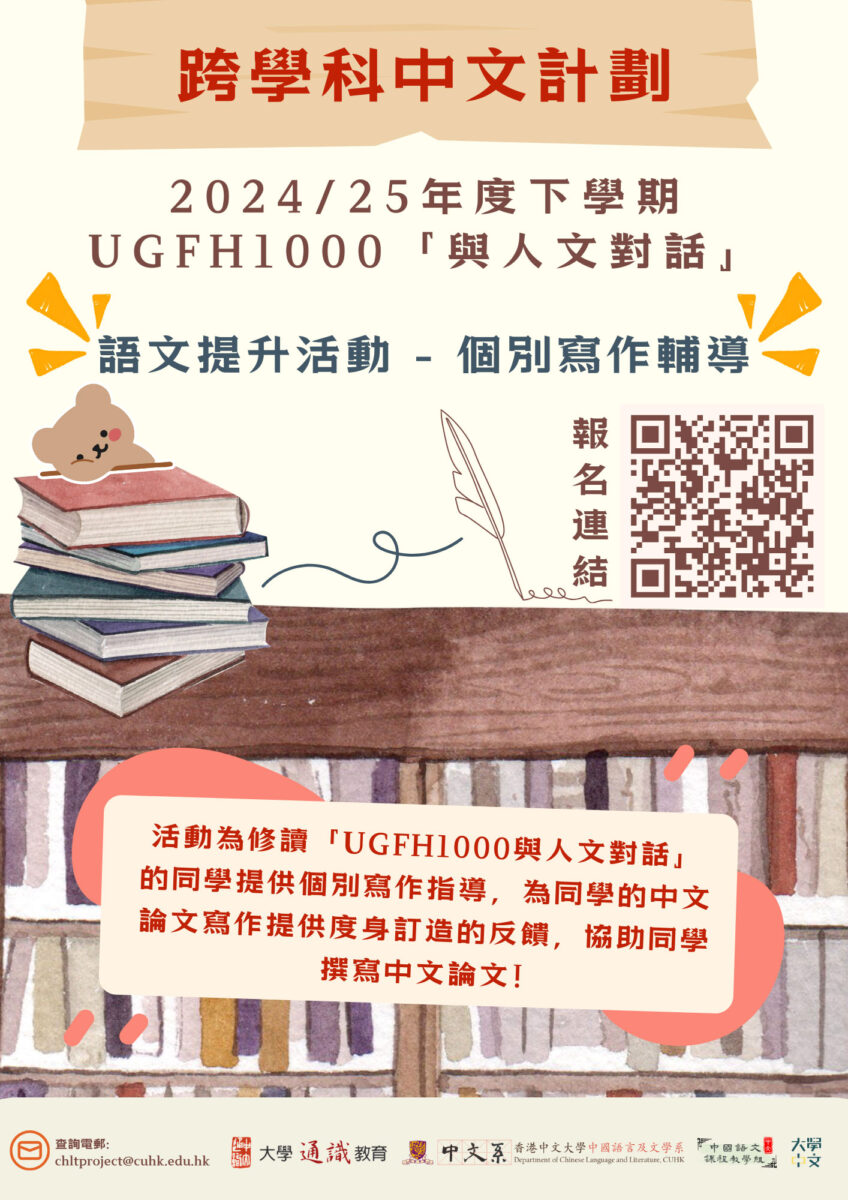 中國語言及文學系與大學通識教育部將於本學期為修讀「UGFH1000與人文對話」的同學提供個別寫作指導,為同學的中文論文寫作提供度身訂造的反饋,協助同學撰寫中文論文。歡迎修讀「UGFH1000 與人文對話」的同學參與!